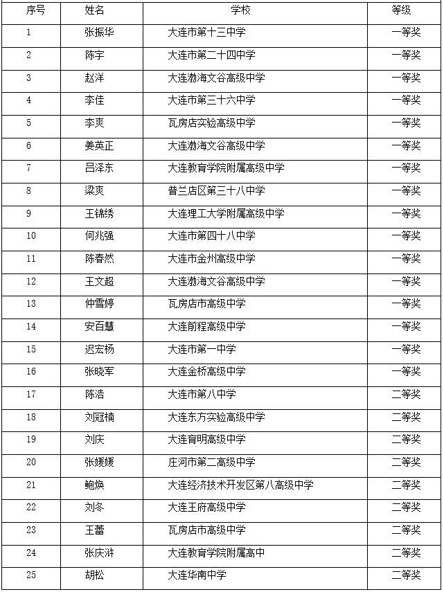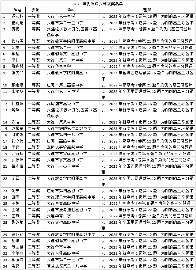 大連市普通高中數(shù)學(xué)學(xué)科解題大賽及優(yōu)質(zhì)課獲獎名單