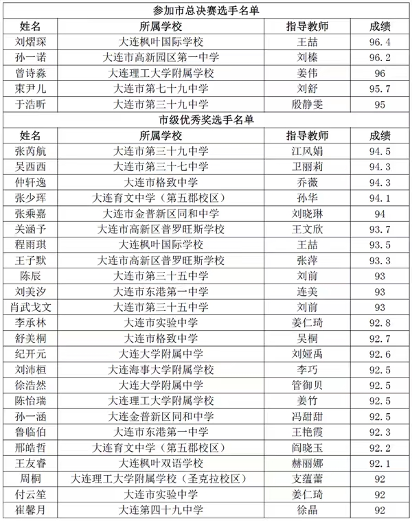 備注:1.初中組入圍市總決賽的選手將參加大連市"楓葉杯"英語(yǔ)演講比賽總決賽,具體事宜由大連市人民政府外事辦公室(下簡(jiǎn)稱市外辦)組織實(shí)施。請(qǐng)等待市外辦電話或短信通知。