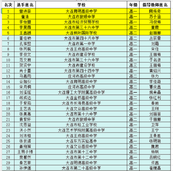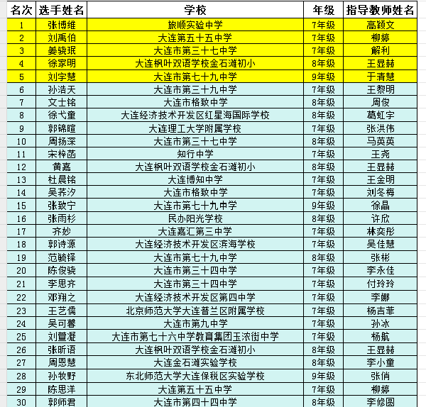 大連市第二十八屆“楓葉杯”演講比賽(小學(xué)、初中、高中組)已經(jīng)圓滿落下帷幕。入圍復(fù)賽的選手獲得“優(yōu)秀獎”。小學(xué)、初中、高中組前五名選手入圍總決賽。現(xiàn)將各組復(fù)賽排名前30名公布如下: